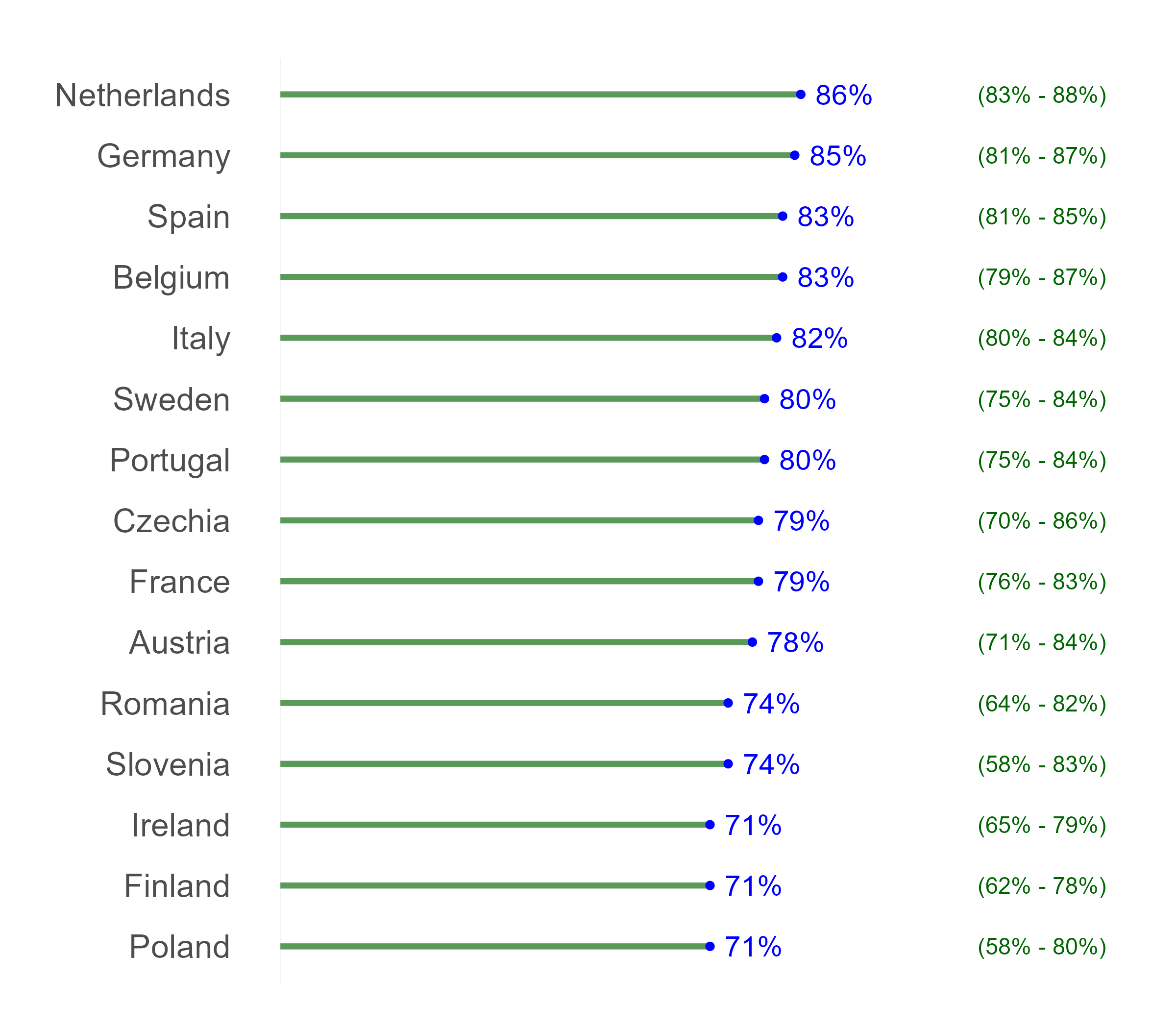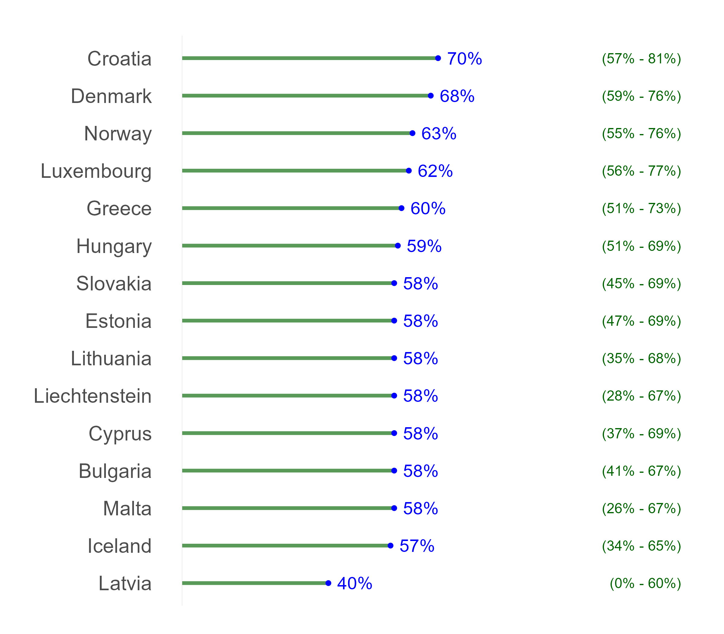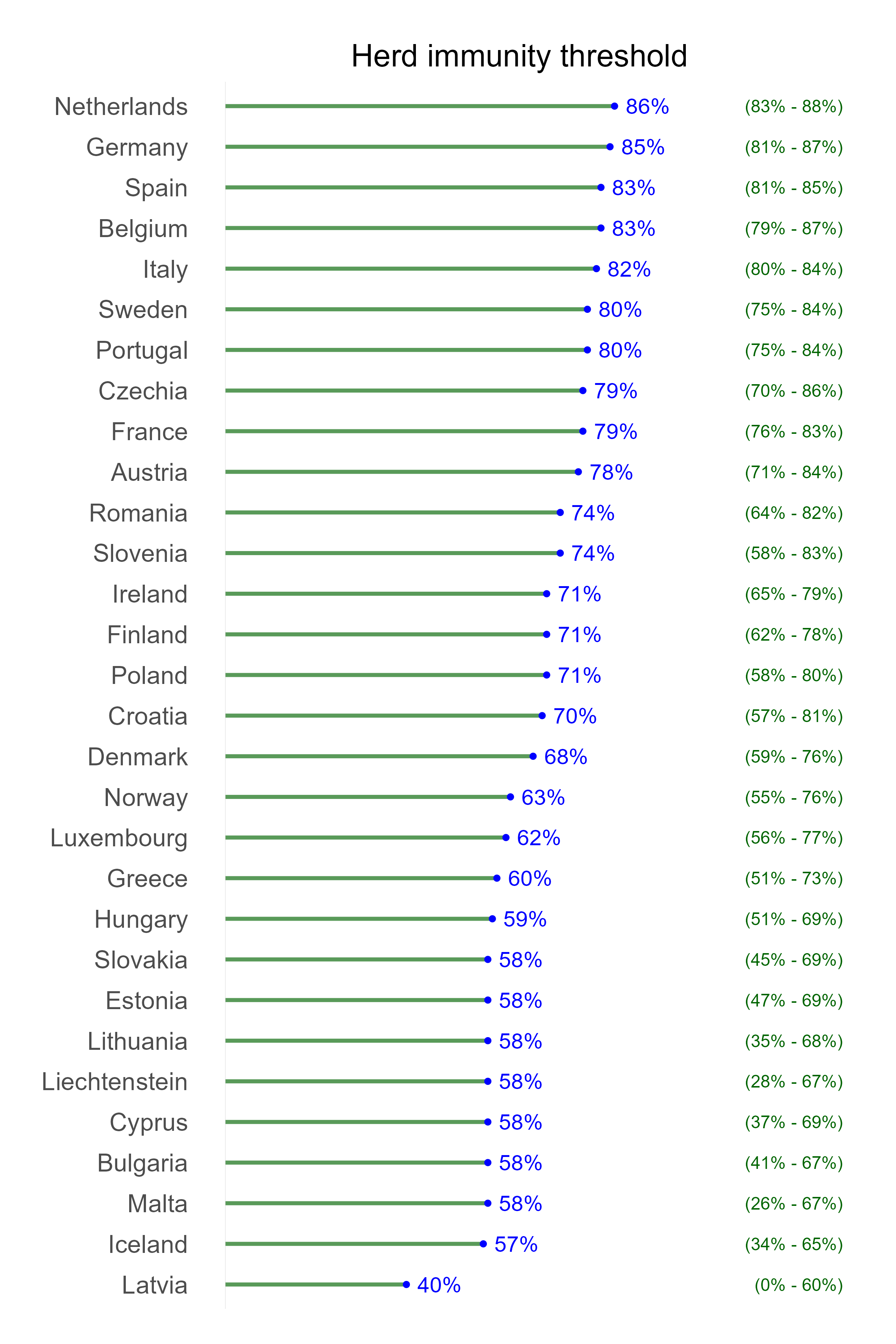 The herd immunity threshold is calculated using the estimations for the basic reproducton number (R0) as follows: (1 - 1/R0)*100.
